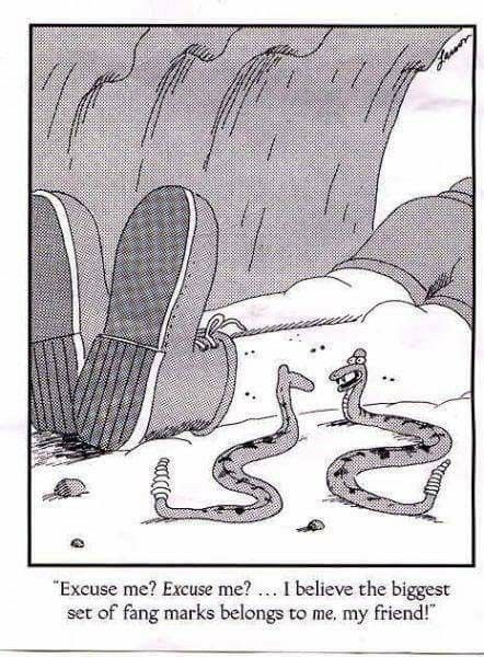 Two snakes arguing over which one left the biggest bite mark? Absolutely peak The Far Side humor — taking natural instincts and making them hilariously petty.