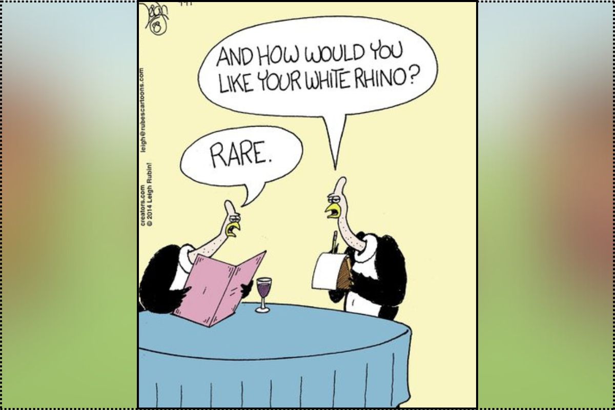Dining etiquette meets endangered species in this darkly hilarious cartoon. Two penguin-like waiters casually discuss how a customer wants their “white rhino” cooked. Leave it to Rubes to find humor in the completely inappropriate and make you laugh despite yourself.