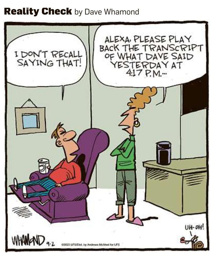 “Alexa, play back what Dave said yesterday at 4:17 PM.” This comic hits home in an age where smart assistants are the new lie detectors. The guy’s panic? Completely justified. Marital justice has never been this hilarious.